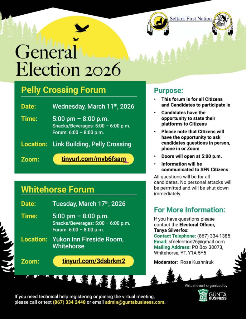 | April 1, 2026 10AM-8PM Pelly: Link Building Whitehorse: Sternwheeler Hotel & Conference Center | April 1, 2026 10AM-8PM Pelly: Link Building Whitehorse: Sternwheeler Hotel & Conference Center |